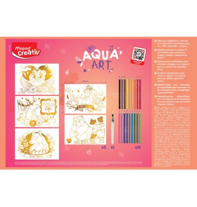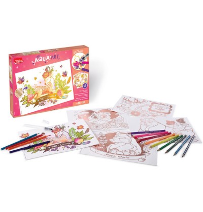 Aqua art maxi set l arte dell acquarello finalmente si presenta facile e realizzabile dai bambini contiene 5 card illustrate con effetto carta da disegno gr 750 formato A4 18 pastelli aqua 1 pennello con serbatoio d acqua 1 manuale Anni 7