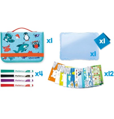 Giochi disegna e cancella animali un set per disegnare e giocare a tema animali che puoi portare ovunque contiene 1 valigetta compatta con 1 astuccio in tessuto 1 lavagna 1 panno antipolvere 4 pennarelli cancellabili nero rosso turchese viola 11 fogli con vari temi sudoko unisci i puntini disegni da colorare simmetria Anni 4