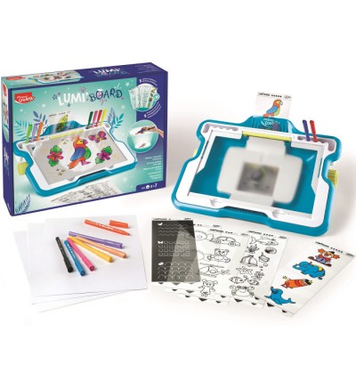 Lumi board impara a disegnare divertendoti traccia i template di luce funziona con 4 batterie LR6 AA non incluse ,contiene n1 lavagna luminosa 30 schede in plastica con sagoma da trasferire 12 pennarelli ocean 20 fogli formato A4 bianchi e aletta parasole 2 manuale Anni 4