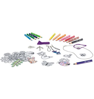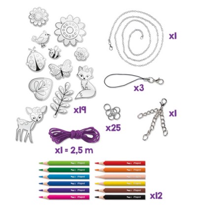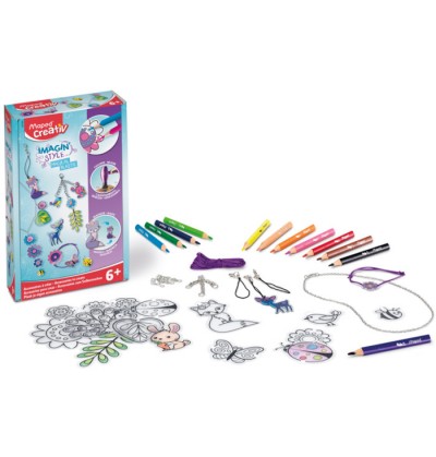 Imagin style magical plastic trasforma i tuoi colori in accessori alla moda e crea il tuo stile contiene 19 design accessori 1 cartoncino da 2,5 m 1 collana 25 anelli di connessione 2 lacci portatili 12 pastelli maped strong mini manuale Anni 6