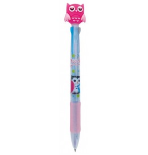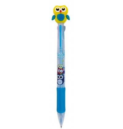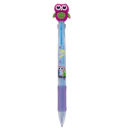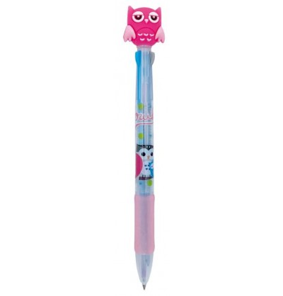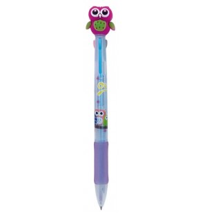 Penne multicolore a scatto 3 colori in 1 fantasia GUFETTO con top in gomma 3 soggetti colori rosso blu nero