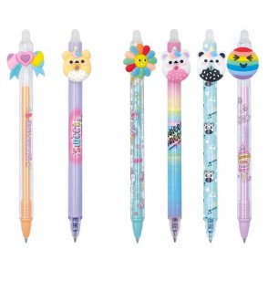 Penna HAPPY cancellabile a scatto lunghezza top piu penna 14,5 cm gommino nel pulsante inchiostro blu 6 soggetti