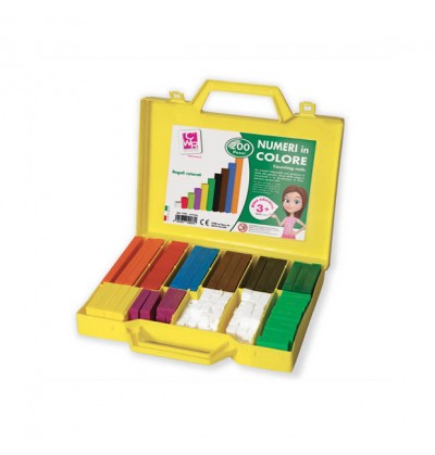 Questo gioco permette di insegnare al bambino in modo efficace e divertente importantissimi concetti matematici: 1) le equivalenze (un regolo arancione vale 10 regoli bianchi); 2) le associazioni valore numerico/colore; 3) i primi calcoli aritmetici (regolo rosso regolo verde = regolo giallo). Valigetta numeri in colore contenuto: 200 pezzi.