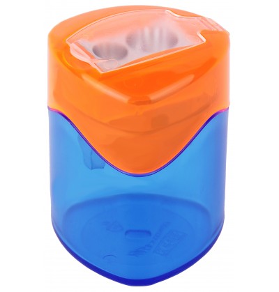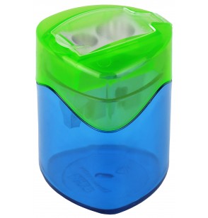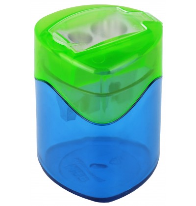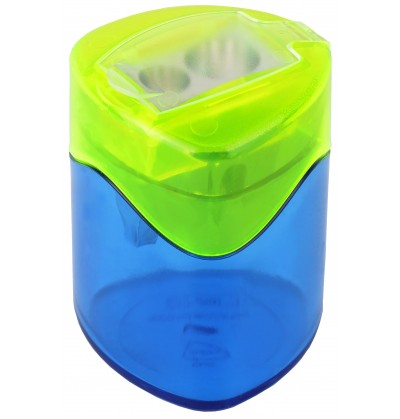 Temperamatite con piano superiore e contenitore in plastica per matite in grafite e pastelli doppio foro con temperino metallico integrato.