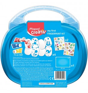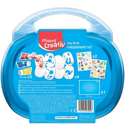 Kit i miei primi colori a dita disegni con colori a dita che utilizzano un sistema di stencil per rivelare il loro segreto semplici da realizzare ma con un risultato magico contiene 2 fogli adesivi decorati 4 stencil 1 tovaglia da 42 cm 3 tubetti di colore a dita da 75 ml rosso giallo blu
